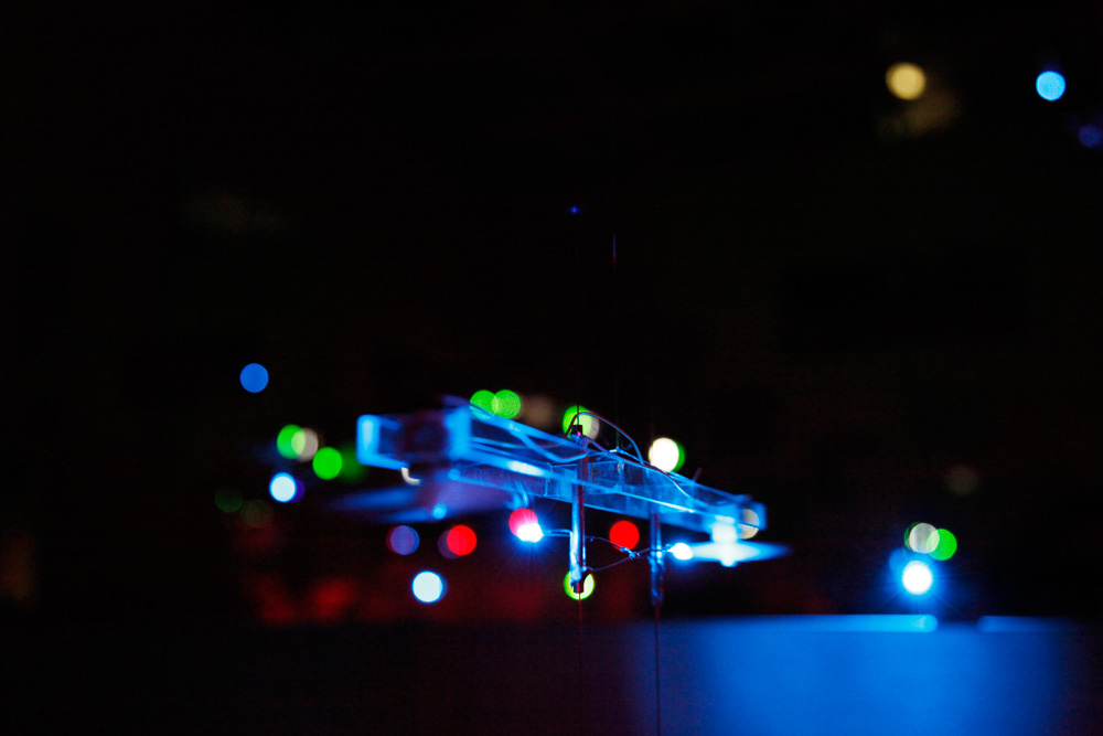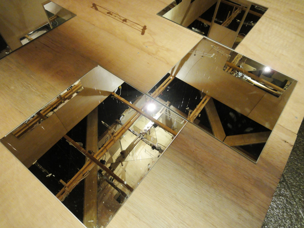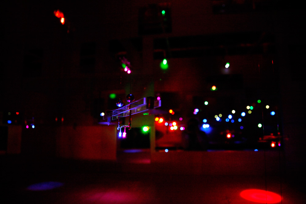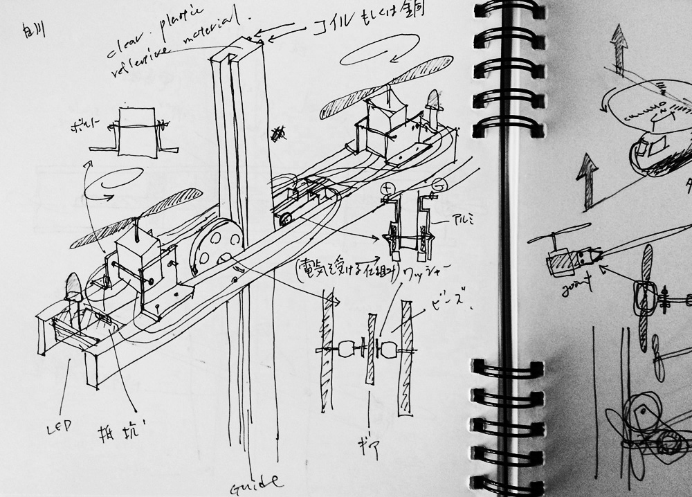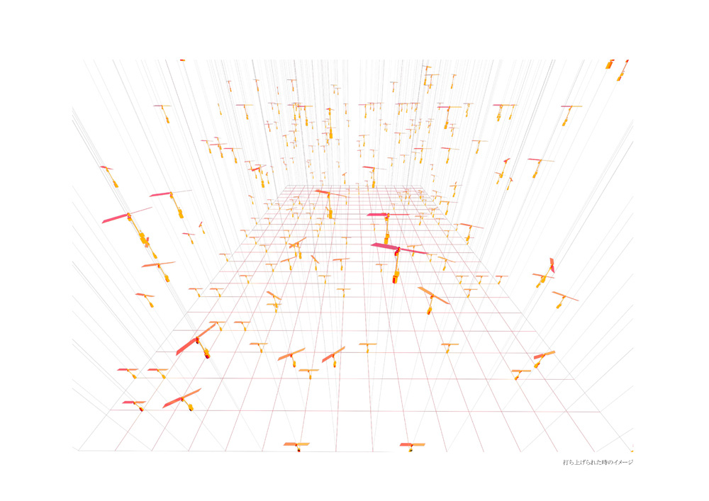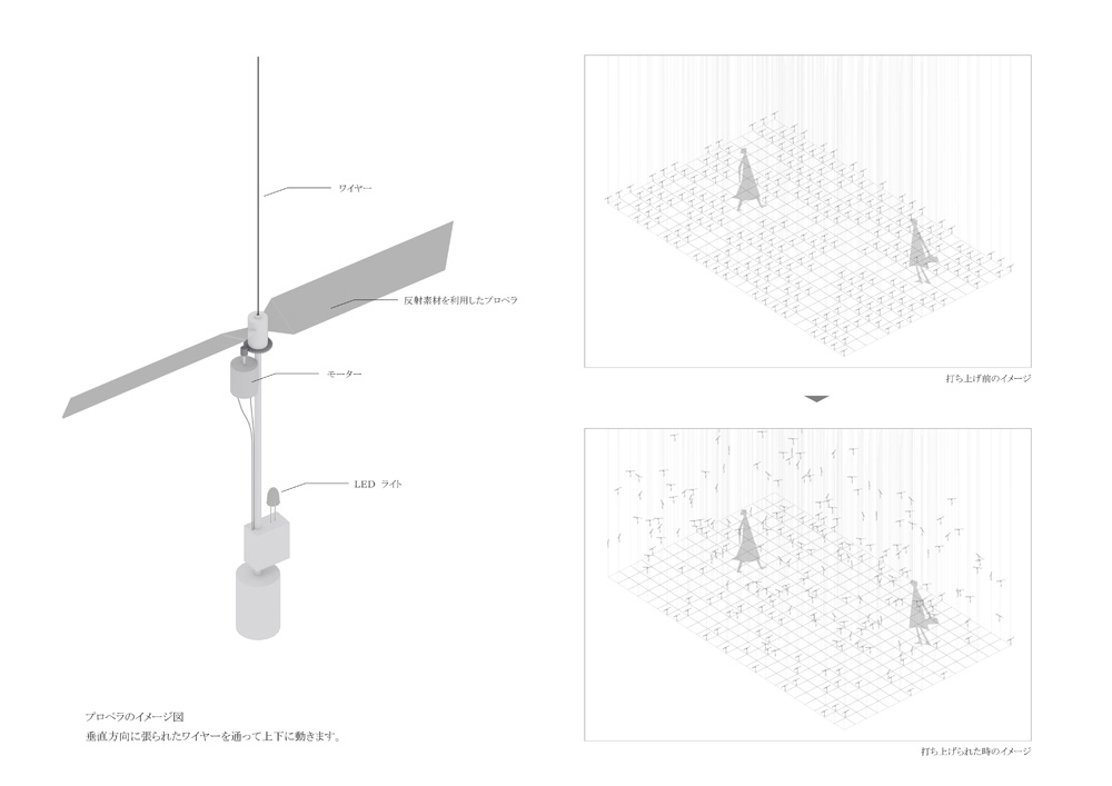 小さなヒカリの翼がミラーキューブの中で上下に昇降する作品。「夢や希望、叶えることのできなかった思い、それでも明日を夢見て生きる」、そんな小さな心のヒカリを飛ばします。プロペラにLEDを取り付けられたものがタイマーによって打ち上げられ、訪れた人はヒカリの中を歩くことができます。また空間構成として、まばらにカガミを壁・床・天井に散りばめることで視点や角度による変化をつけ、「夢の中=方向性のない場所」の表現を試みました。