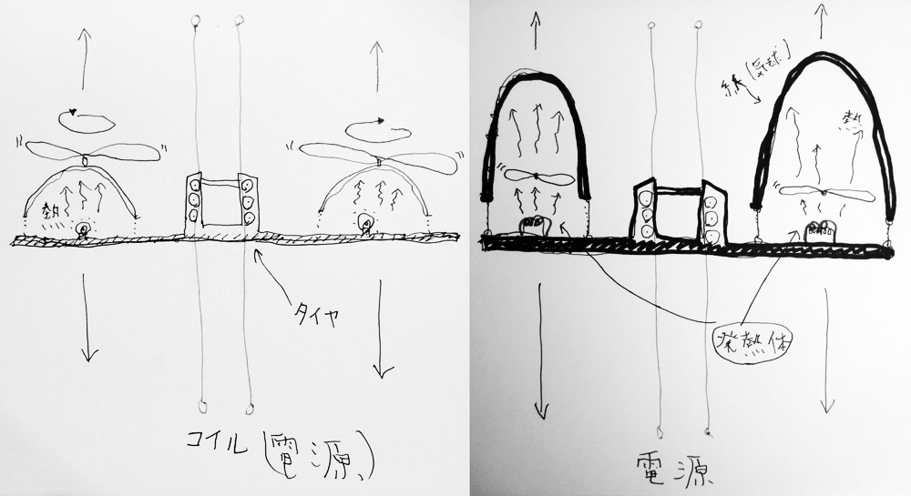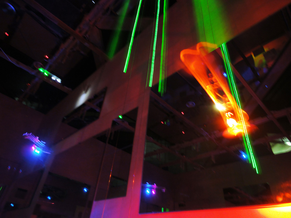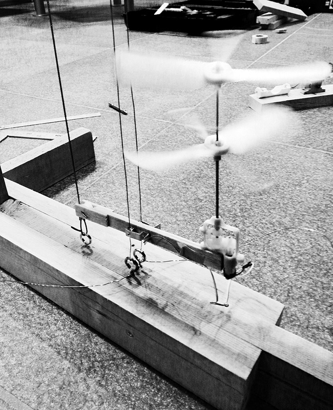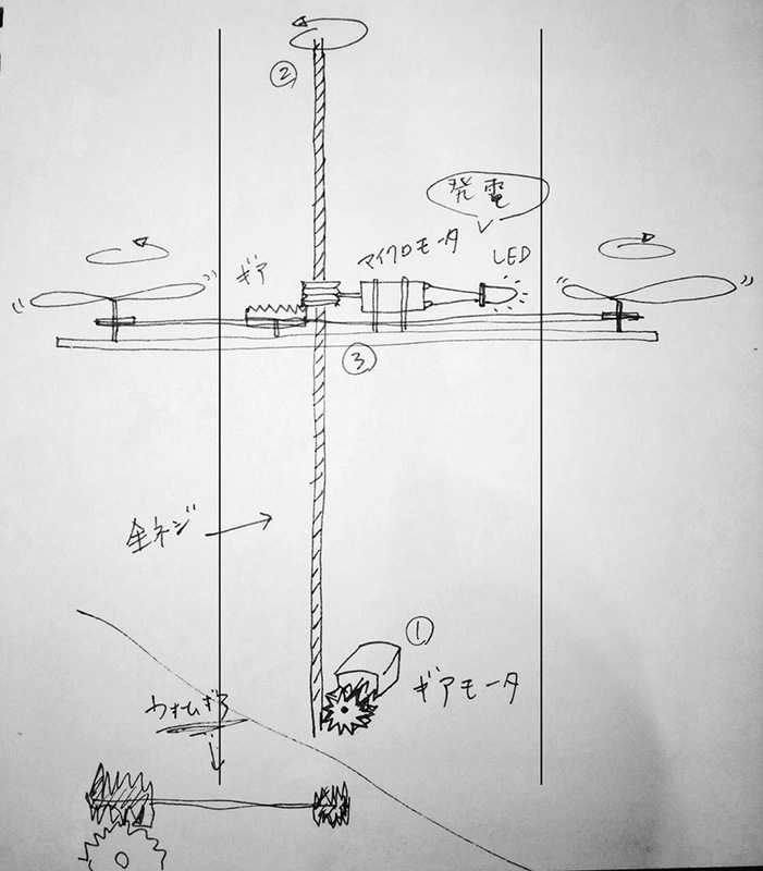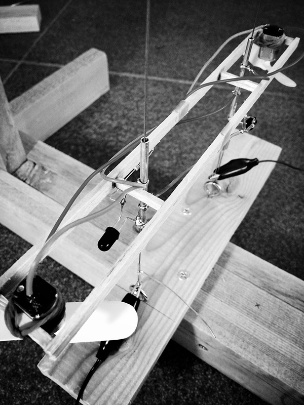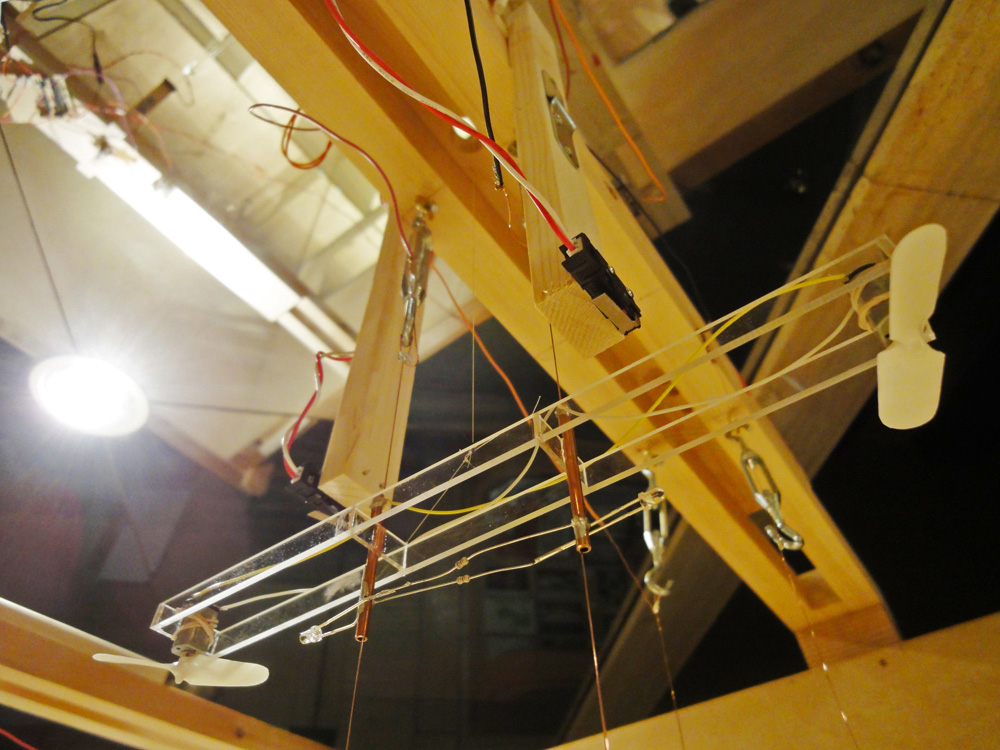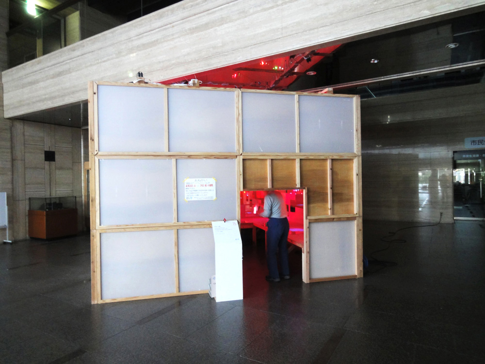 小さなヒカリの翼がミラーキューブの中で上下に昇降する作品。「夢や希望、叶えることのできなかった思い、それでも明日を夢見て生きる」、そんな小さな心のヒカリを飛ばします。プロペラにLEDを取り付けられたものがタイマーによって打ち上げられ、訪れた人はヒカリの中を歩くことができます。また空間構成として、まばらにカガミを壁・床・天井に散りばめることで視点や角度による変化をつけ、「夢の中=方向性のない場所」の表現を試みました。