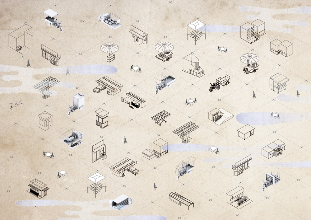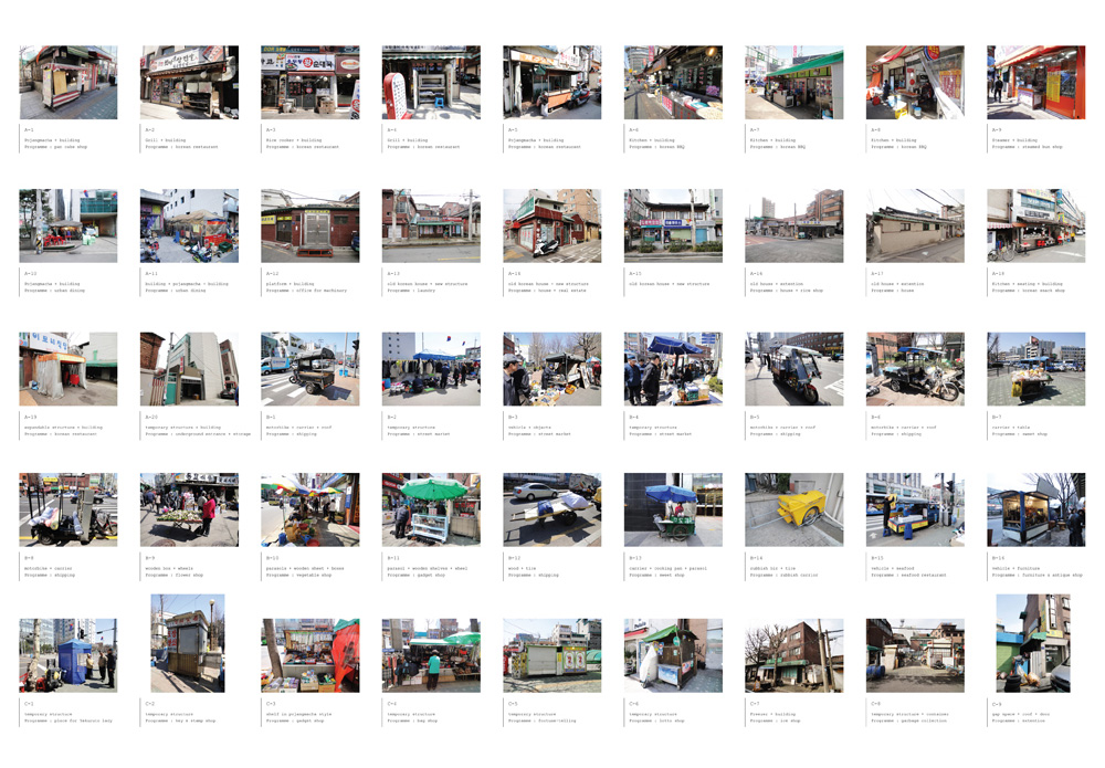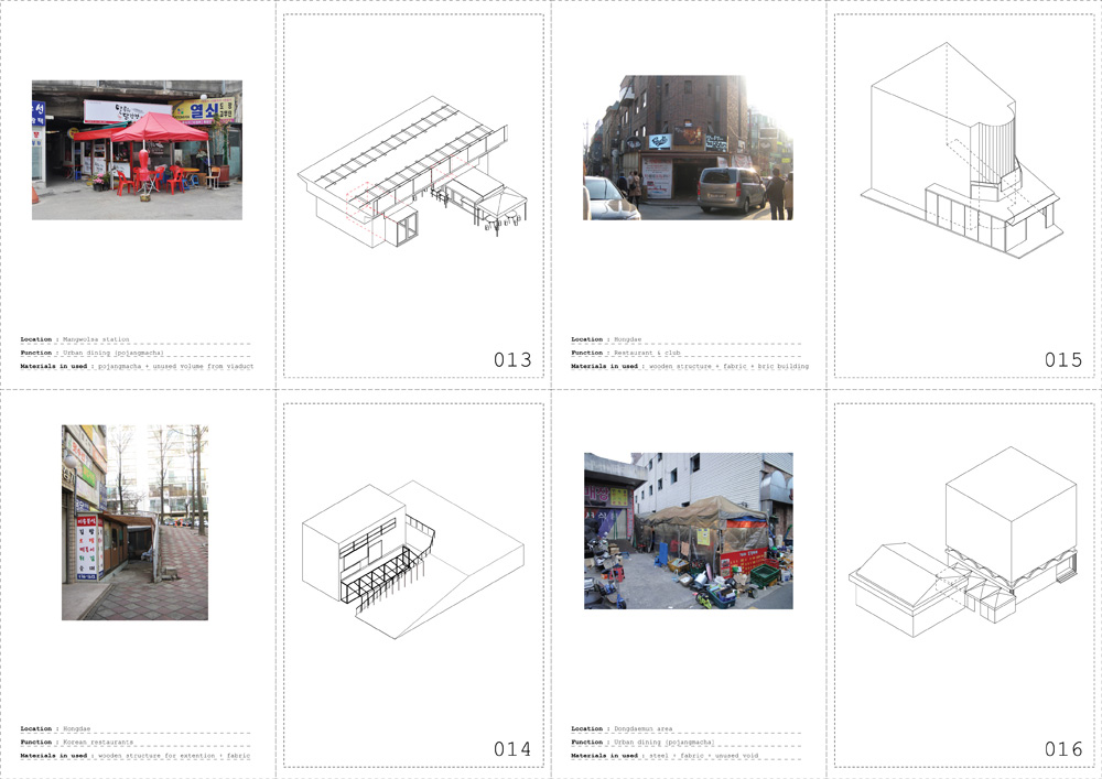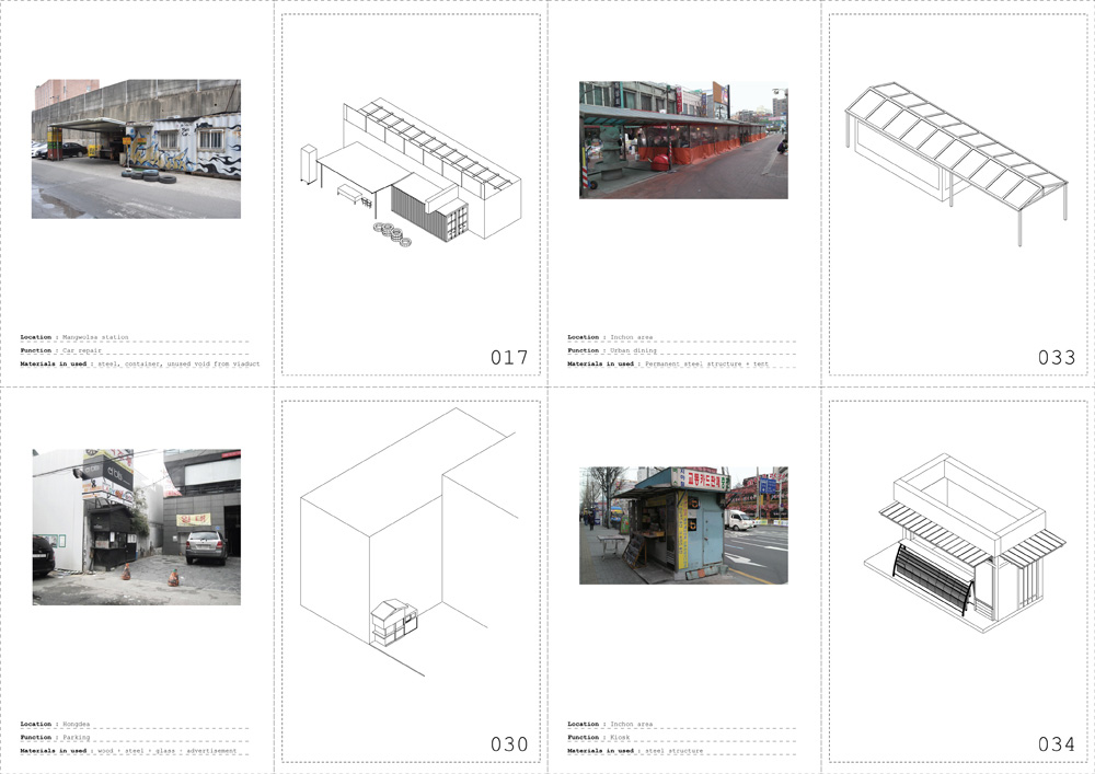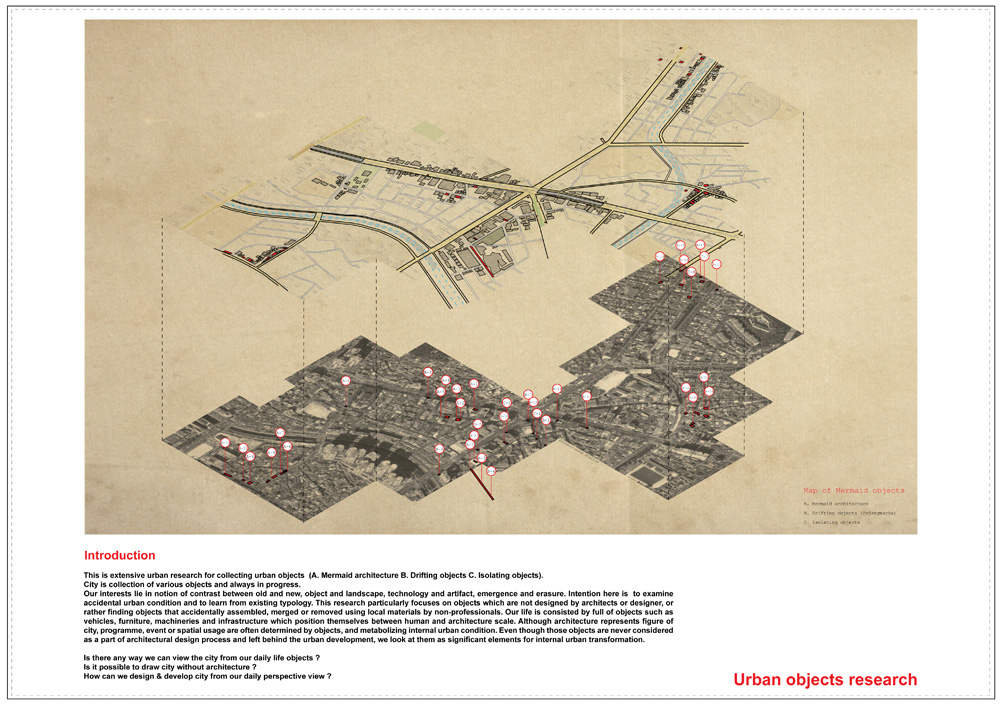 Our interests lie in notion of contrast between old and new, object and landscape, technology and artifact, emergence and erasure. Intention here is to examine accidental urban condition and to learn from existing typology. This research particularly focuses on objects which are not designed by architects or designer, or rather finding objects that accidentally assembled, merged or removed using local materials by non-professionals. Our life is consisted by full of objects such as vehicles, furniture, machineries and infrastructure which position themselves between human and architecture scale. Although architecture represents figure of city, programme, event or spatial usage are often determined by objects, and metabolizing internal urban condition. Even though those objects are never considered as a part of architectural design process and left behind the urban development, we look at them as significant elements for internal urban transformation.